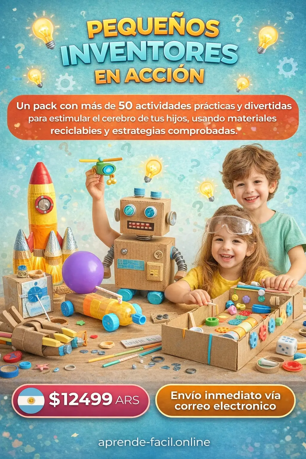➜ PEQUEÑOS INVENTORES EN ACCIÓN – Un pack con más de 50 actividades prácticas y divertidas para estimular el cerebro de tus hijos, usando materiales reciclables y estrategias comprobadas. La forma más simple de alejarlos de las pantallas mientras desarrollan creatividad, lógica y habilidades motoras.